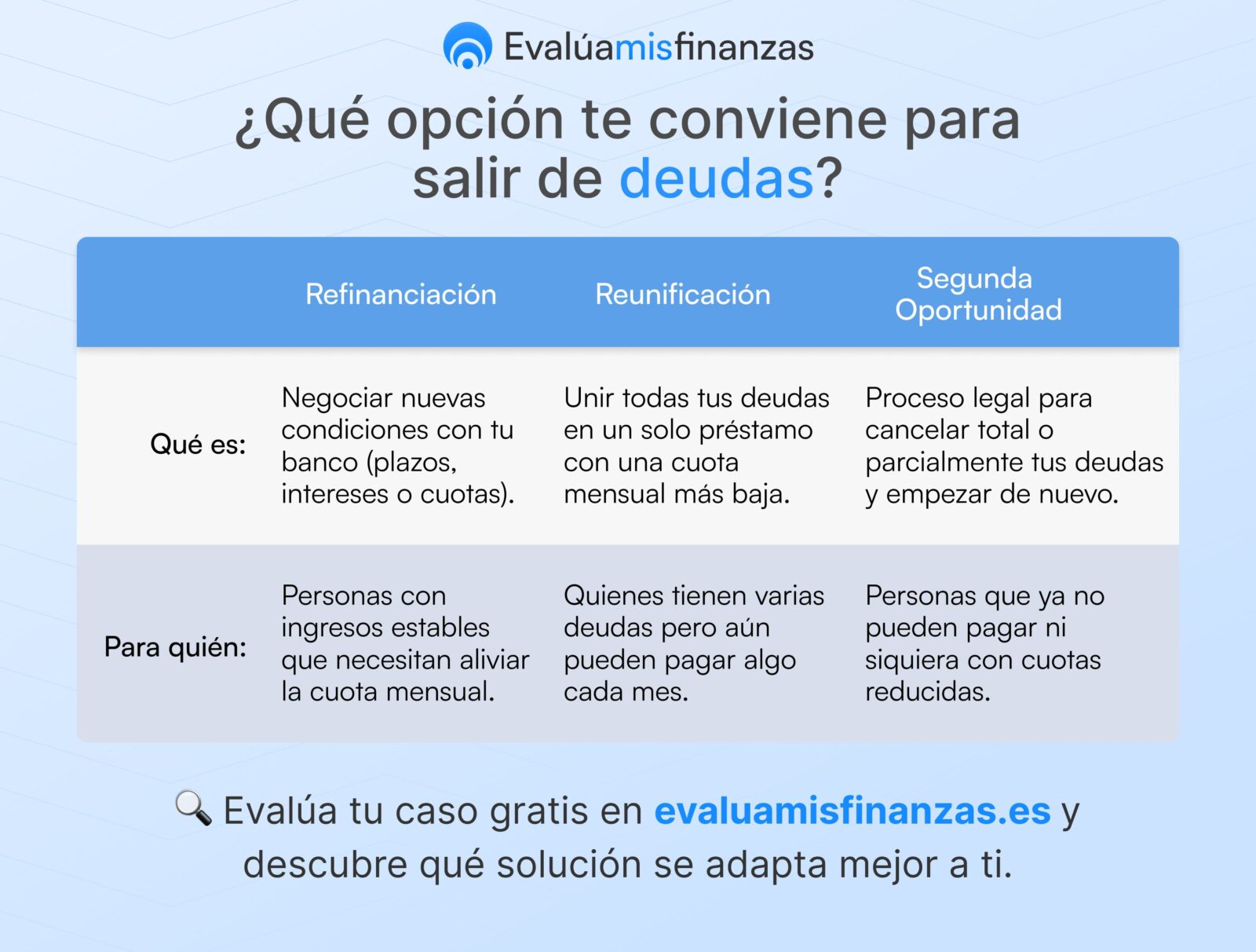 • Refinanciación o reunificación: adecuadas si aún tienes ingresos estables y puedes asumir una cuota reducida. Son útiles para reorganizar deudas cuando las dificultades son temporales, pero implican pagar más intereses a largo plazo.